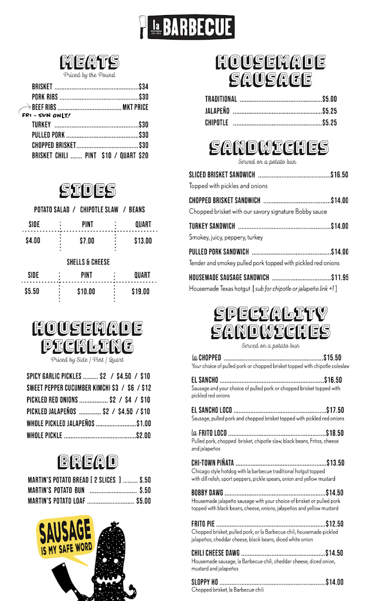 As you approach la Barbecue, you’ll quickly sense the excitement that surrounds this culinary hotspot. A casual yet lively atmosphere greets you, where barbecue enthusiasts gather to savor the incredible dishes that have earned a dedicated following. Their acclaimed Super Bowl Packages serve as the perfect way to enjoy their standout offerings during game day or large gatherings, featuring tender brisket, pulled pork, and sausage accompanied by creamy potato salad, slaw, and their oh-so-delicious shells and cheese.
